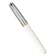 Ручка выполнена из прочной нержавеющей стали, покрытой великолепным белым жемчужным лаком. Колпачок, украшенный сложной геометричной гравировкой, дополнен напылением золота и палладия, придающим ему неповторимый блеск.