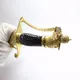 Отделка кинжала выполнена с использованием самых ценных материалов: латунь, покрытая золотом высшей пробы, дополняется роскошной инкрустацией из драгоценных камней – рубина, изумруда и бриллиантов.